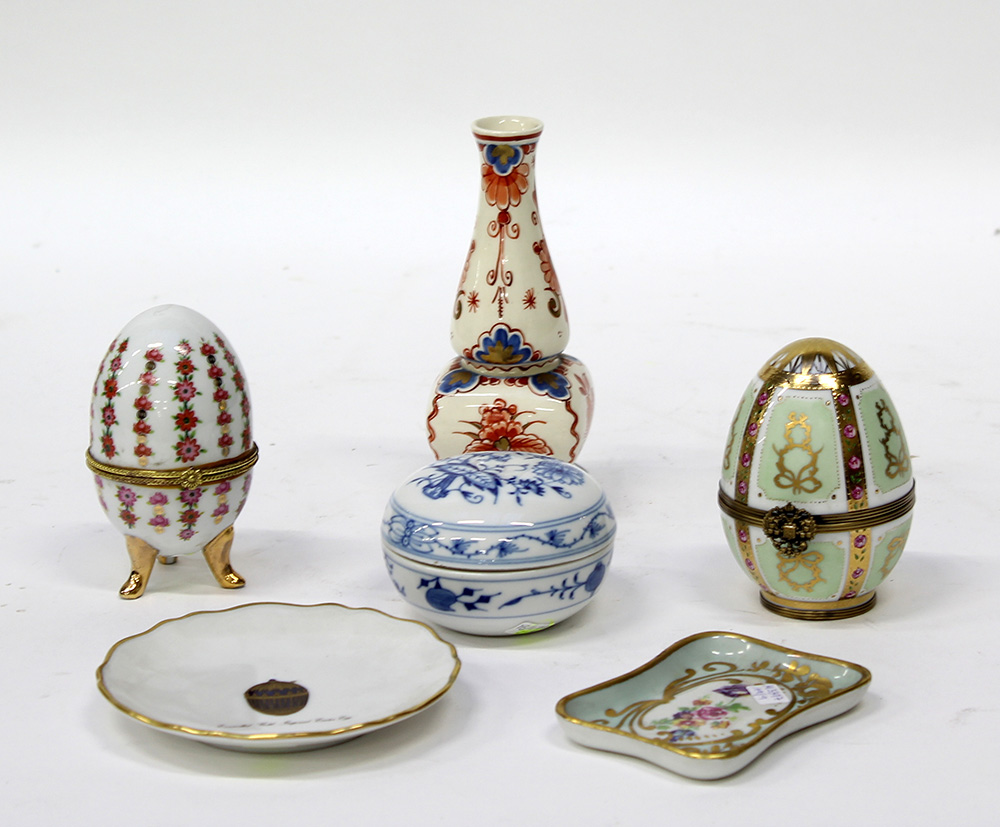 Manifattura diverse. Lotto composto da due scatole a forma di uova e una di Meissen e tre oggetti diversi (difetti)