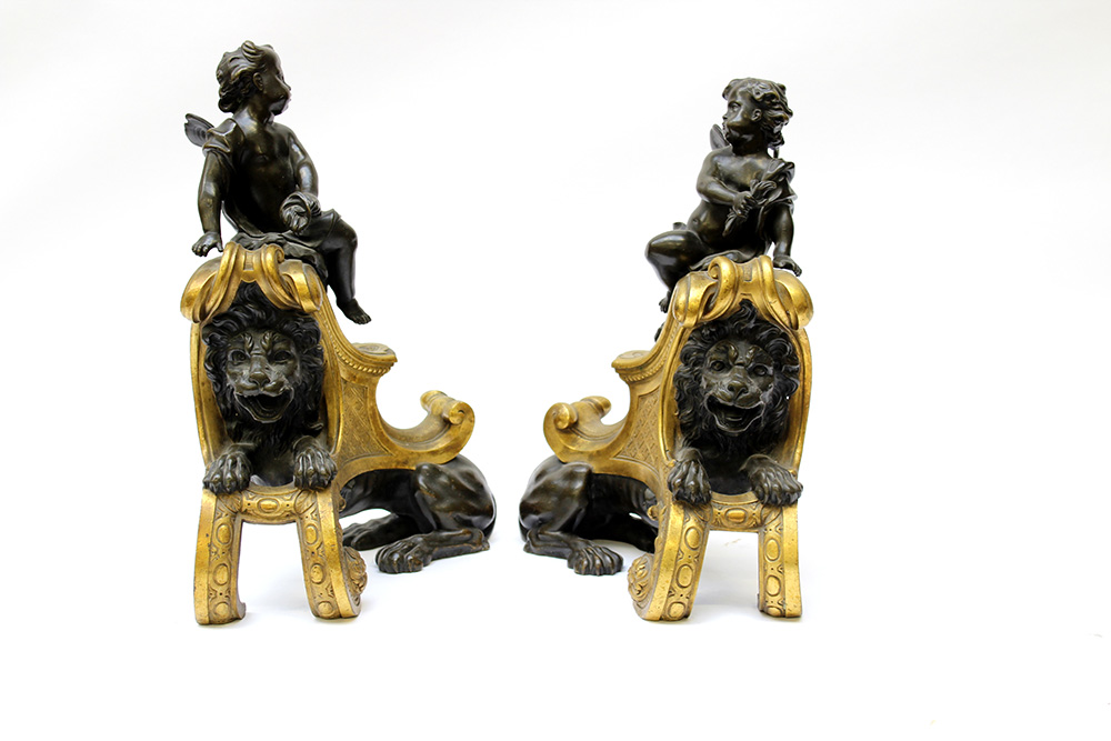 Coppia di alari in bronzo brunito e dorato raffiguranti leoni e putti alati