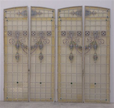 Coppia di vetrate in vetro piombato decorati a mazzi fioriti e motivi geometrici