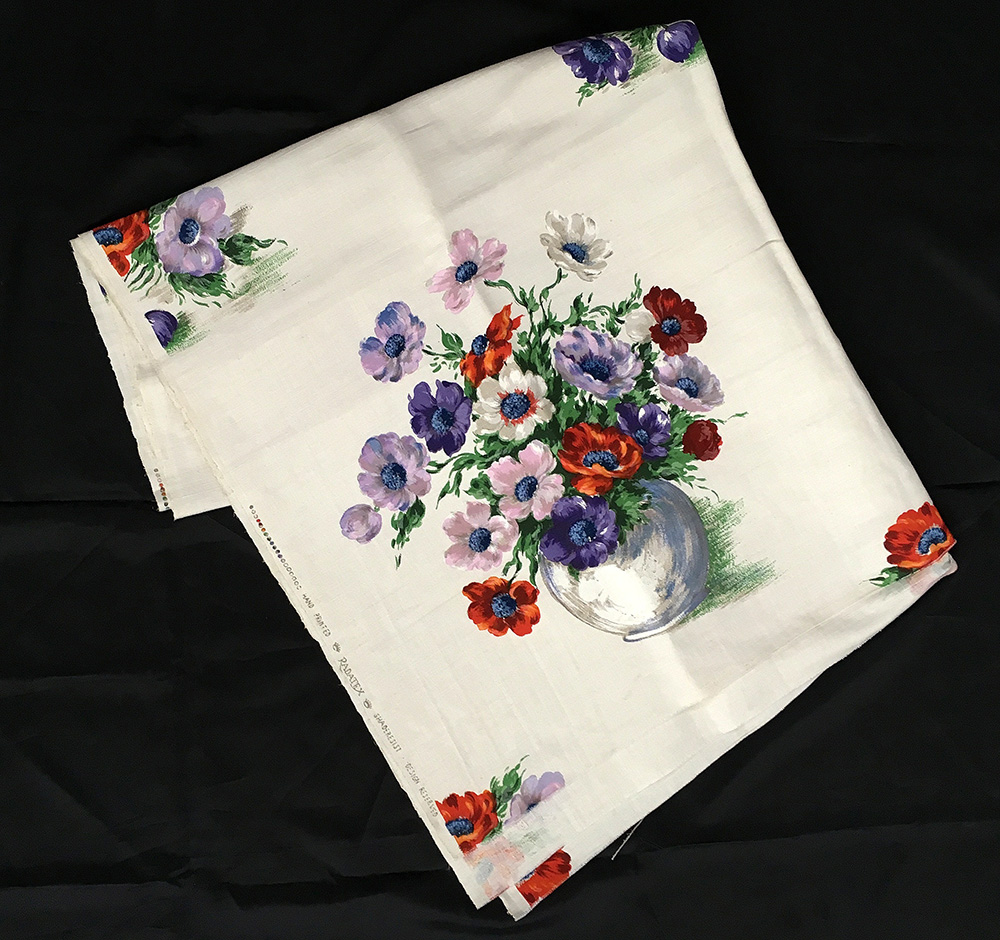 Metraggio di cotone stampato ditta "Redatex", Inghilterra, anni '50, con motivo di un vaso di fiori con anemoni su fondo bianco (cm 234x132)