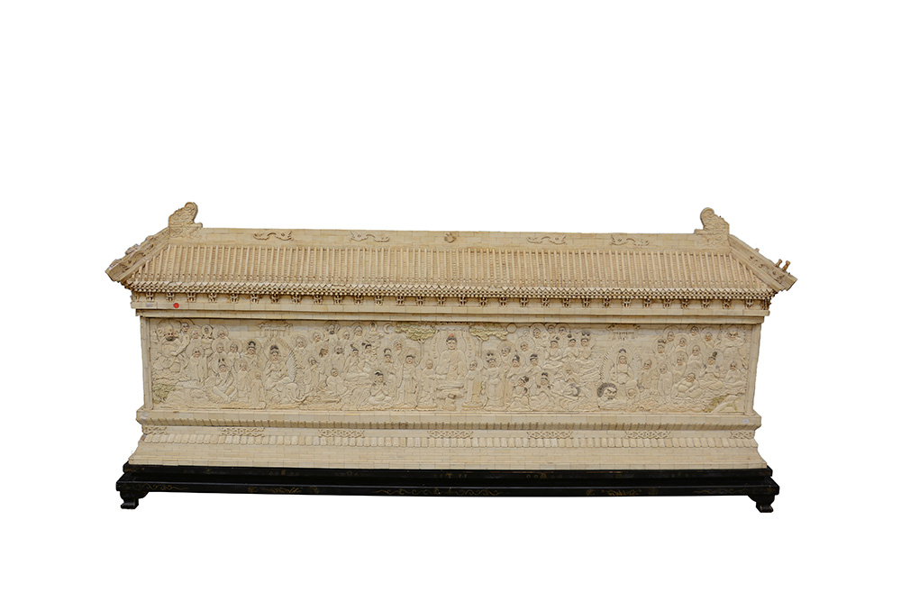 Schermo da centro in avorio a tasselli decorato con divinità buddiste da un alto e scritta arcaica dall'altro, con base in legno (difetti)(220x95 ccm.)