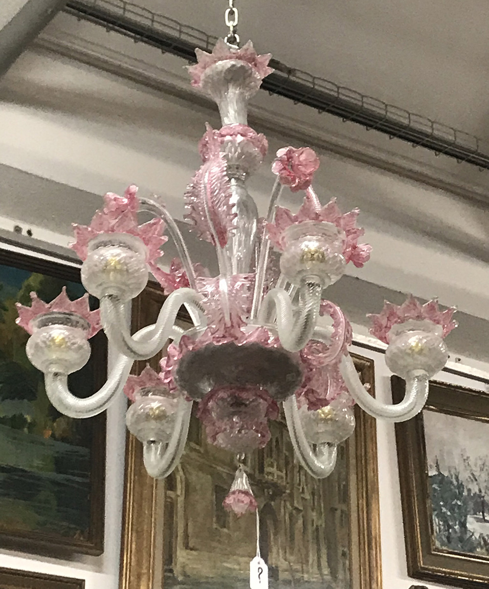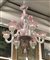 Lampadario a sei luci in vetro trasparente con decoro a foglie e fiori rosa. Secolo XX.
