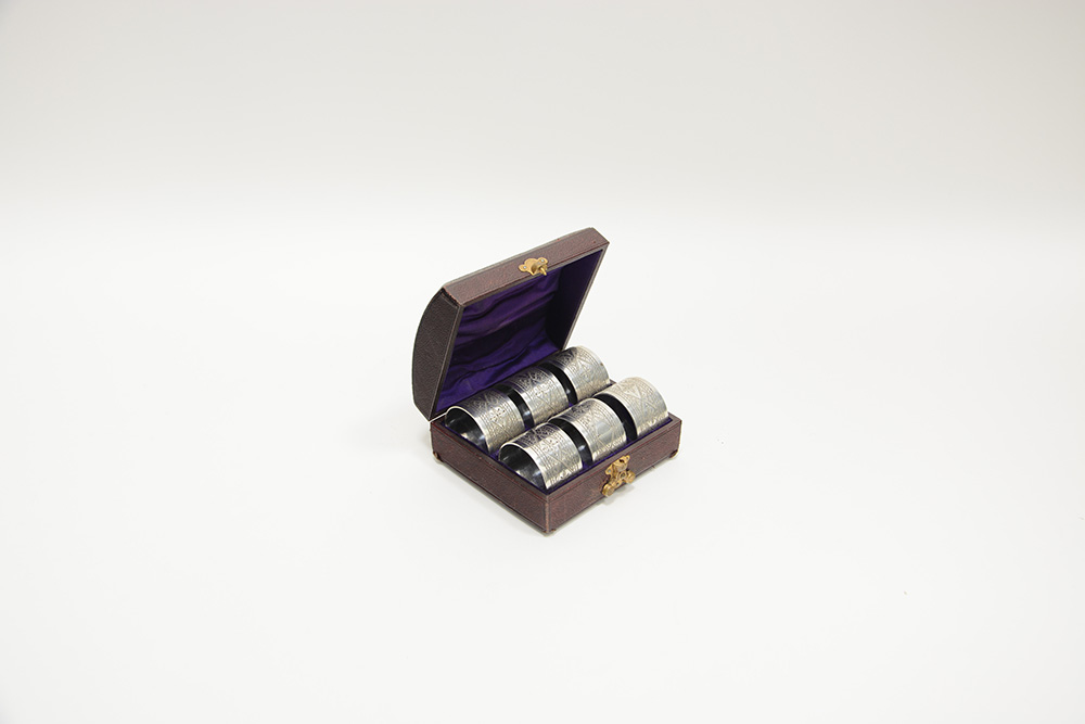 Gruppo di sei portatovaglioli in metallo argentato cesellat a motivi geometrici. In custodia in pelle impressa in oro. Inizio secolo XX
