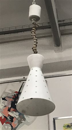Coppia di lampade a saliscendi ad una luce con diffusori in vetro incamiciato lattimo acidato sulla superficie esterna e decorato a pois verde. Italia, anni '50/'60. (h cm 32) (difetti)