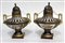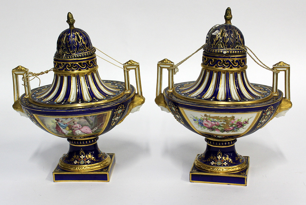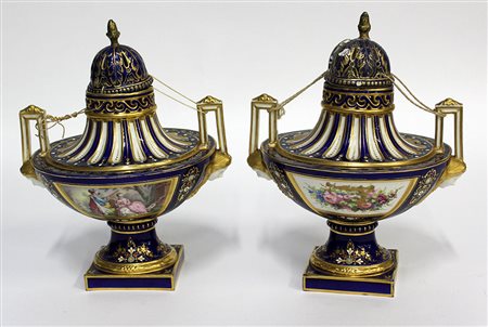 Manifattura francese, secolo XIX. Coppia di vasi biansati in porcellana a fondo blu, decorati in policromia e dorature a motivi vegetali e ascene galanti e mazzi di fiori. (h cm 24) (difetti)