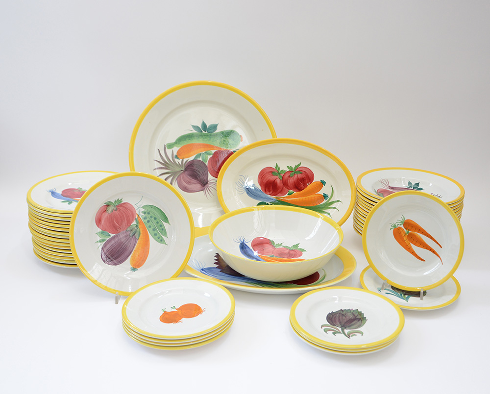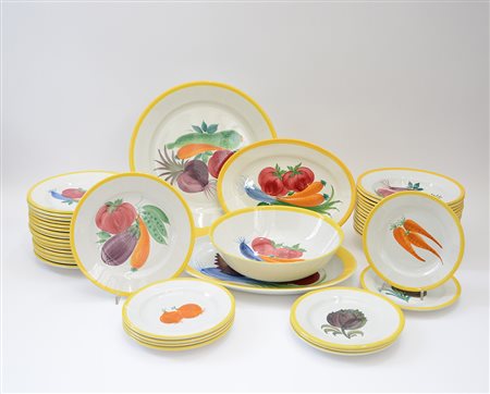 Manifattura Galvani, Pordenone. Parte di servizio da tavola in ceramica decorato con ortaggi, composto da quattordici piatti fondi e diciassette piani, nove piattini da frutta, due raviere, due piatti da portata ovali e uno tondo e un’insalatiera. Anni '50/'60 (lievi difetti)