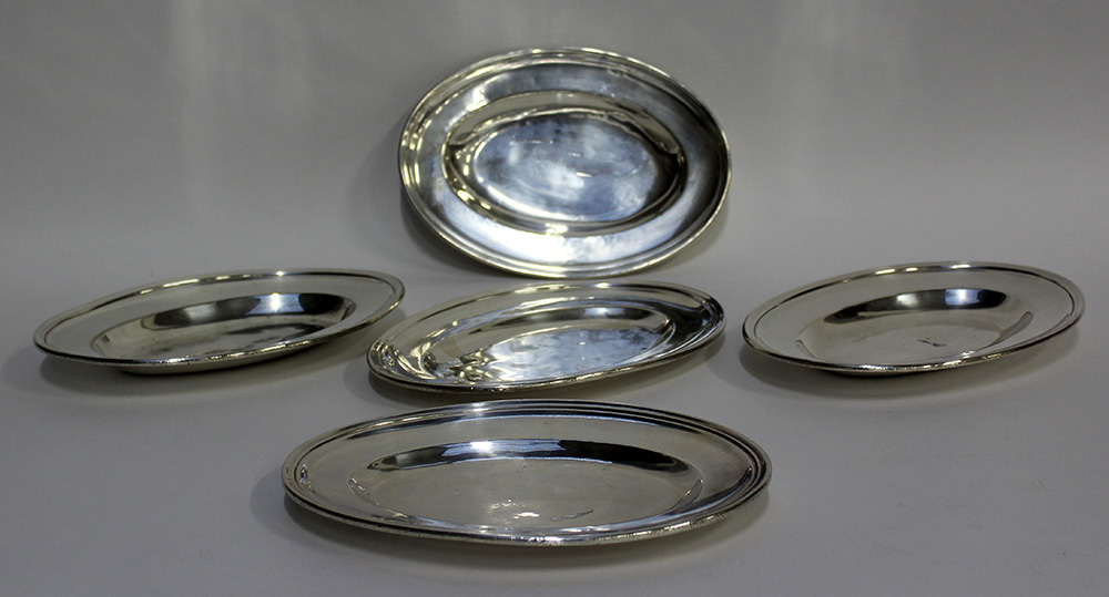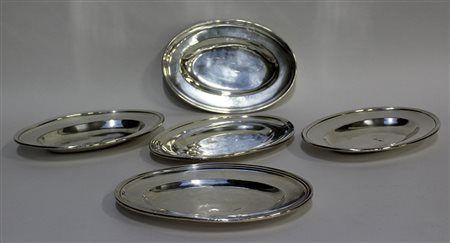 Cinque vassoietti di forma ovale in metallo lisci (cm 28)