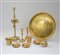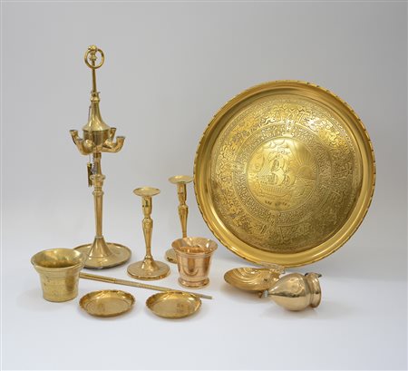 Cartone contenente una lampada fiorentina, due candelieri, un vassoio ed...