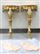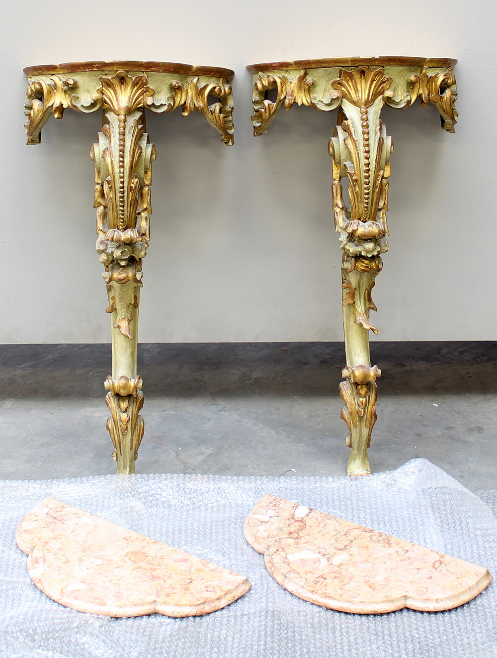 Coppia di consolles in legno laccato e traforato, intagliato a volute e motivi vegetali. Piano in marmo (cm 36x76x19) (difetti)