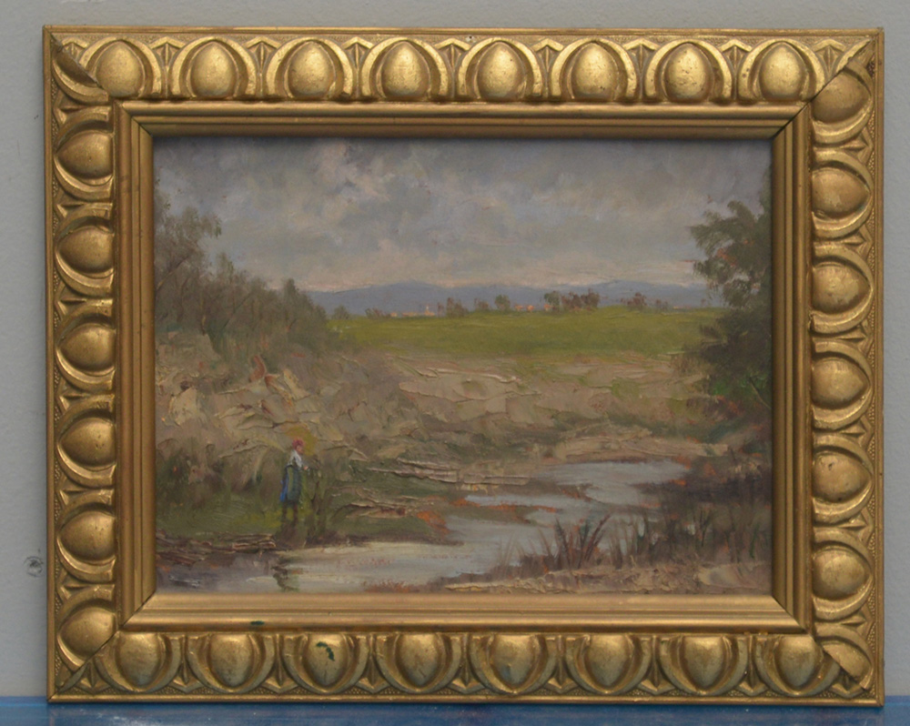 "Nel Savena presso Bologna" olio su cartone pressato, titolato iscritto e datato 1929 al verso (cm 19x25) in cornice (difetti)