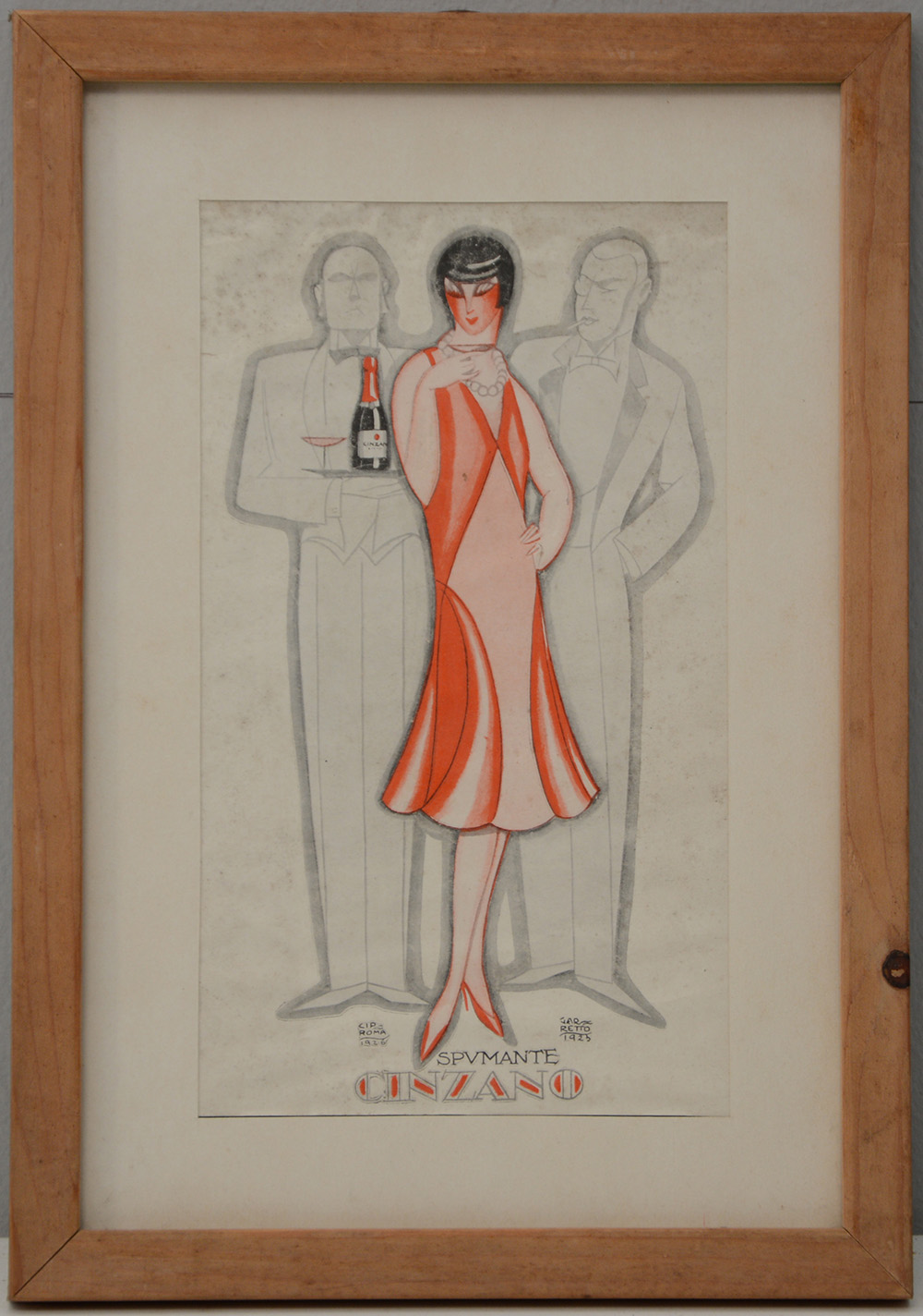Litografia a colori raffigunte pubblicità dello Spumante Cinzano, 1925. Firma e data stampate in basso a destra. In cornice (difetti)