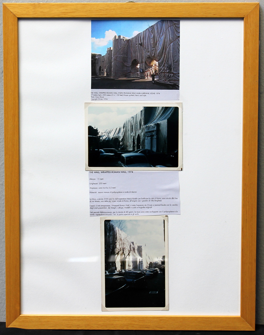 Due fotografie/documenti che testimoniano il lavoro di Christo e Jeanne-Claude per il "Wrapped Roman Wall", Roma, 1974. Ciascuna cm 12,5x9. In cornice
