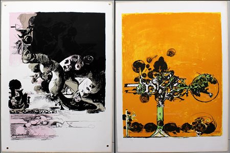 "L'ultimo Paesaggio" cartella editoriale contenente sette litografie a colori disegnate su lastre di zinco dall'artista tra il 1970 e il 1979 e stampate postume nel 1982. Ed. II/XX con il timbro a secco della firma di Sutherland su ciascun foglio in basso a destra. La raccolta include anche una litografia di Guttuso, numerata e firmata in basso a matita e un testo di Giorgio Soavi. Teodorani Editore, Milano, 1982 (lievi difetti)