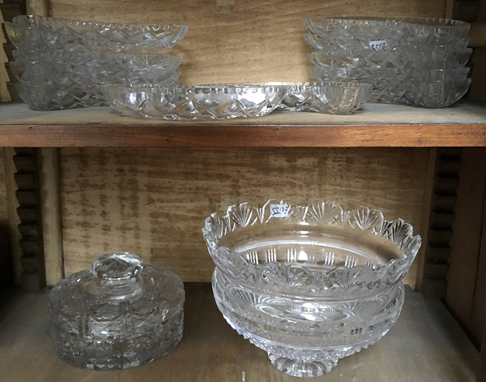 Lotto di cristalli molati composto da un centrotavola, una scatola con coperchio e dodici antipastiere a mezza luna (difetti)