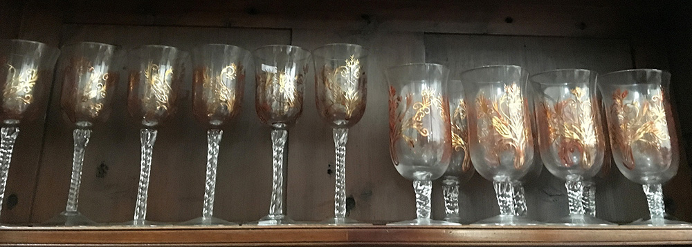 Parte di servizio di bicchieri in cristallo con coppe dipinte composto da sei calici da vino e otto per acqua (lievi difetti)