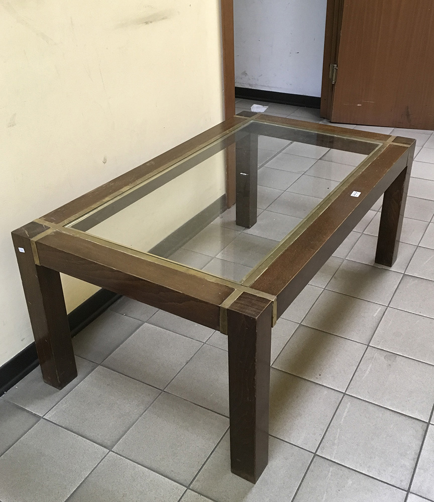 Tavolino da salotto in legno con gambe squadrate, inserti in ottone e piano in cristallo. Anni '70. (cm 100x43x60) (difetti)