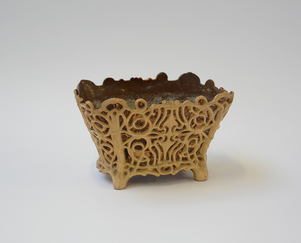 Piccolo centrotavola in terraglia decorato in rilievo ed a finto marmo, secolo XIX (cm 23x14x16)(difetti)