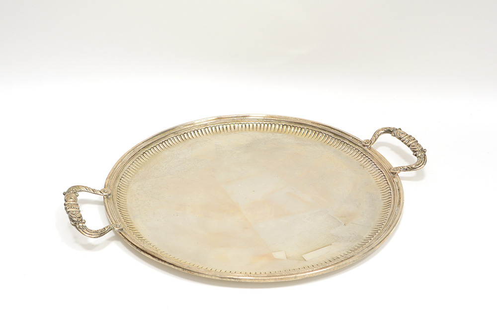 Vassoio tondo biansato in argento con manici decorati in rilievo e bordo interno baccellato (gr 850 circa) (d cm 46) (lievi difetti)