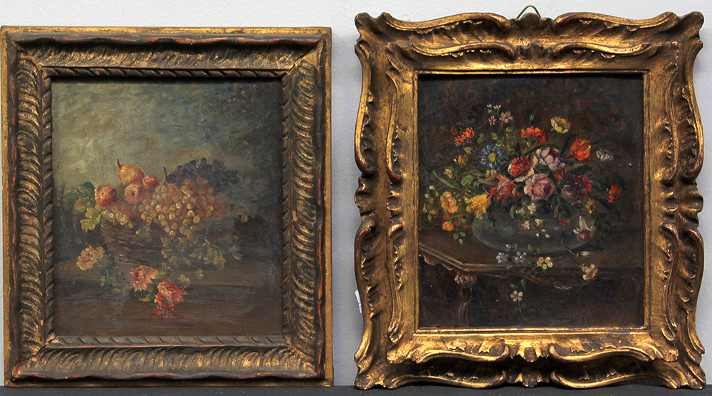 Lotto composto da due piccoli dipinti ad olio raffiguranti composizioni con frutta e fiori