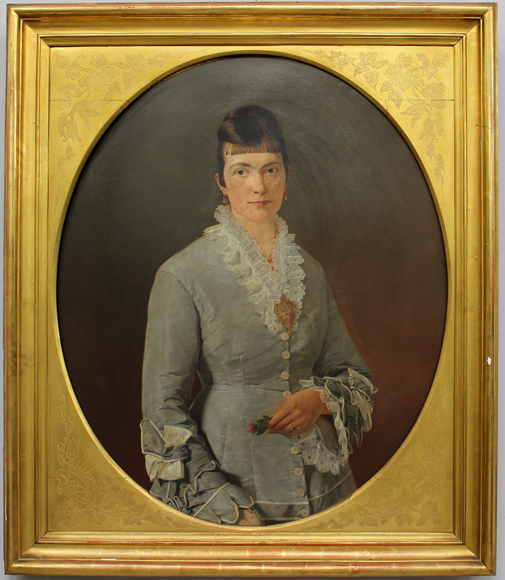 Scuola del secolo XIX,"Ritratto di gentildonna con fiori in mano" olio su tela (cm 100x82) in cornice coeva (difetti)