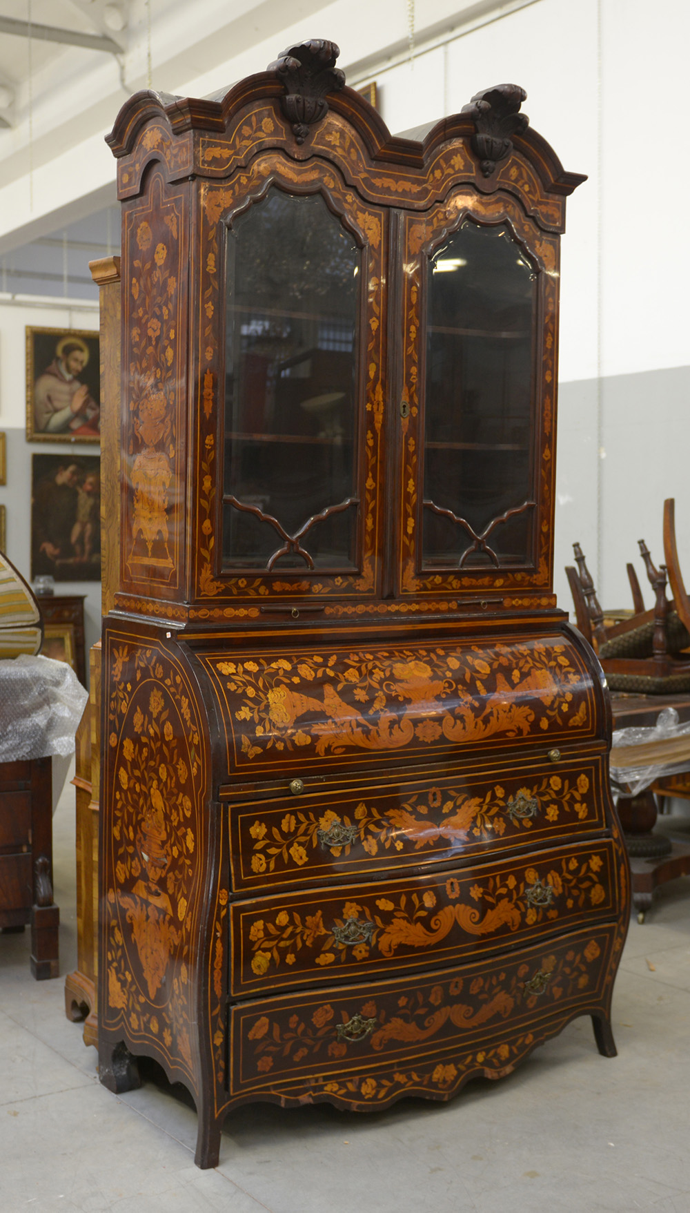 Mobile a due corpi interamente intarsiato in legni vari a volute e fiori. Parte superiore a due ante a vetri ed inferiore con ribalta a rullo. Olanda secolo XIX (cm 113x236x58) (difetti e restauri)