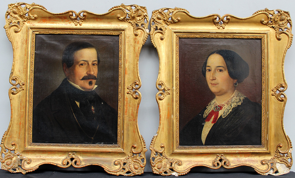 Artista del secolo XIX, coppia di ritratti di coniugi, olio su tela (cm 50x40) in cornice dorata coeva (difetti e mancanze)