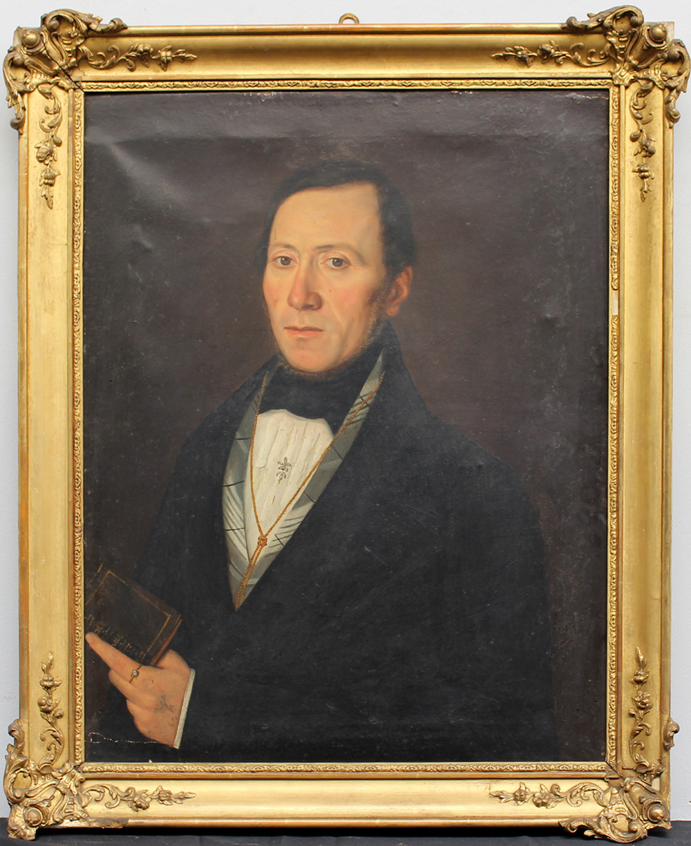 Scuola del secolo XIX, "Ritratto di gentiluomo con libro" olio su tela (cm 60x48) in cornice in legno a pastiglia dorata (difetti)