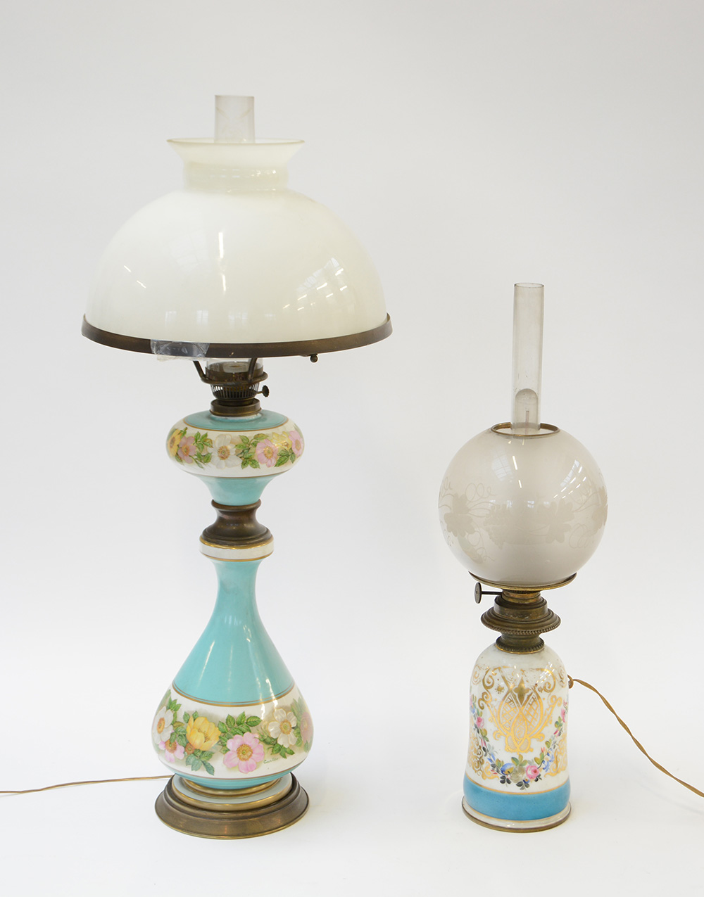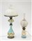Lotto composto da due lampade ad olio in porcellana di diverso decoro (difetti)