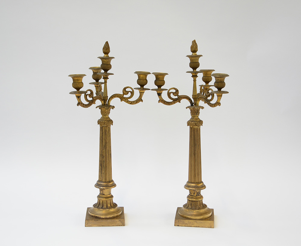 Lotto 4036 | Coppia di candelieri in bronzo a quattro fiamme con fusto a colonna scanalata...