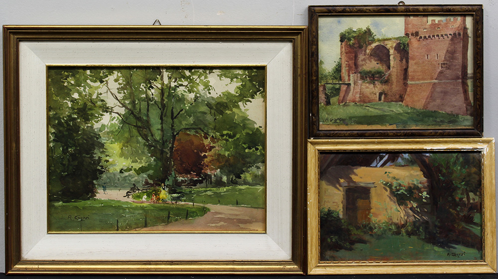 A. Guzzi Lotto di quattro acquarelli raffiguranti paesaggi di misure diverse,...