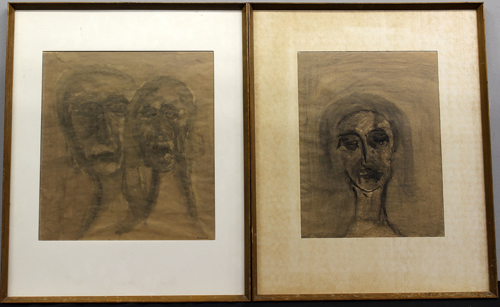 “Volti”, lotto di due disegni a china su carta (cm 34x31 e 34x26) firmati in basso a destra, in cornici (lievi difetti)