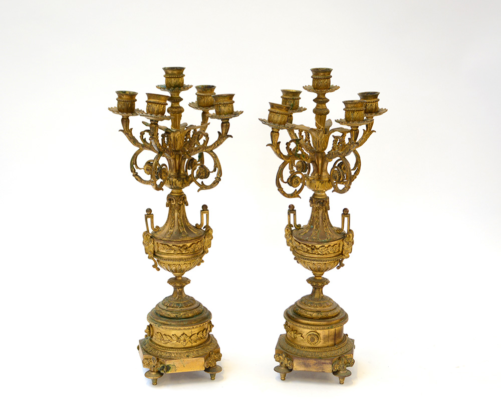 Coppia di candelabri in bronzo dorato a cinque luci con decori fogliacei (h cm 48) (difetti)