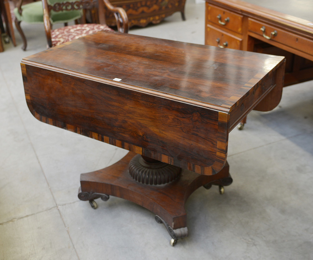 Tavolo ad alette ad un cassetto sotto piano con gamba centrale a colonna sfaccettata poggiante su mensola, secolo XIX (cm 54x72x97)(difetti e mancanze)