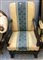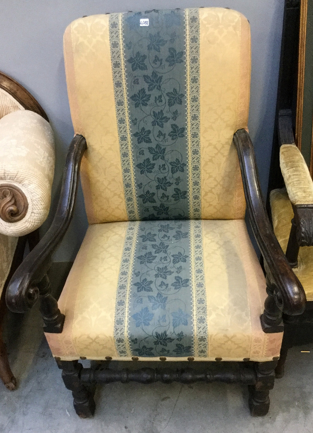 Poltrona con struttura in legno intagliato e tornito, seduta e spalliera rivestite in tessuto rigato. Secolo XVII (difetti e restauri)