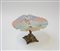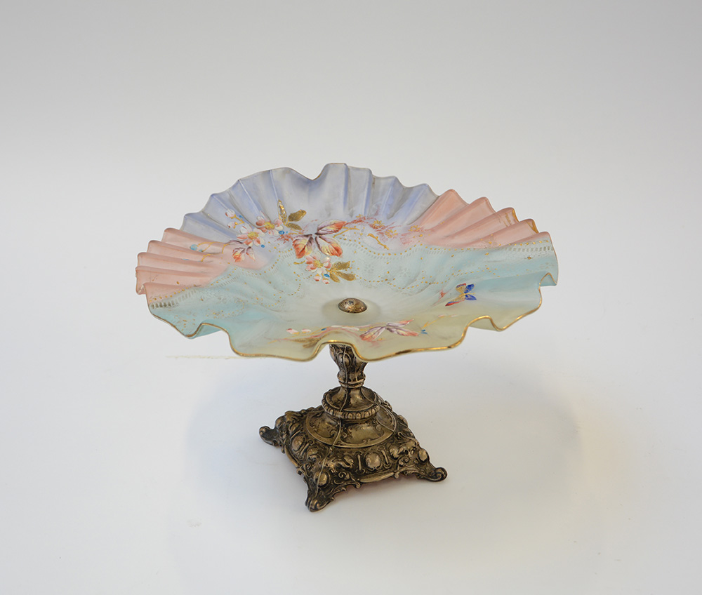 Alzata centrotavola con base in lamina d’argento e piatto in vetro decorato a freddo a farfalle e fiori (difetti)