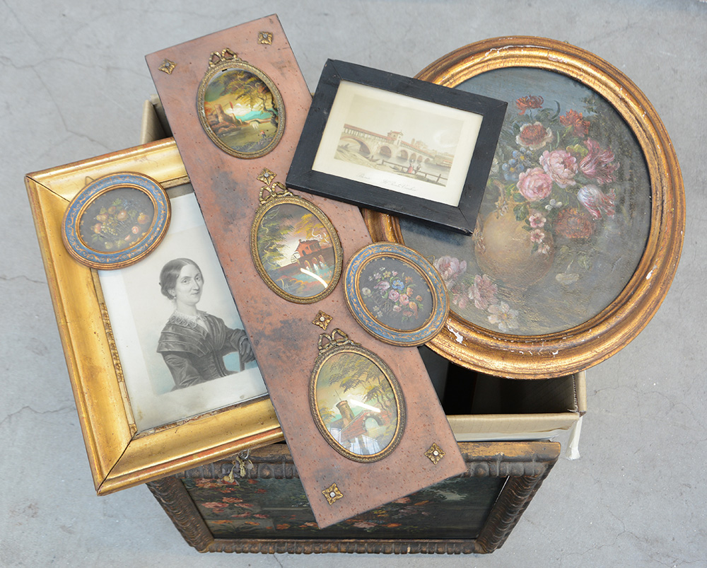 Lotto 4110 | Cartone contenente numerose stampe e dipinti di autori diversi (difetti)