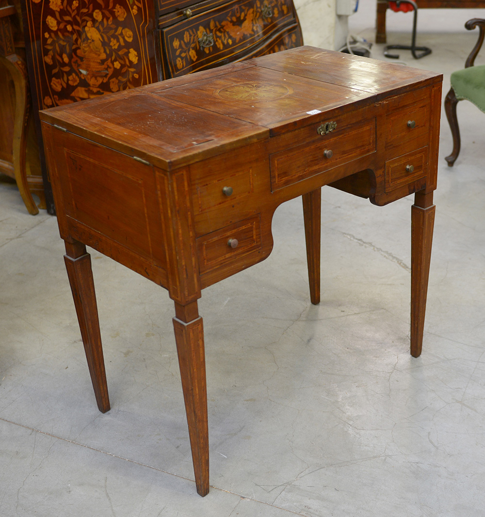 Mobile toilette in noce con piano filettato e intarsiato a rosone (cm...