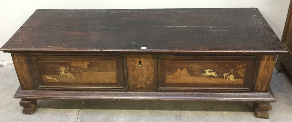 Lotto 4137 | Cassapanca in noce con fronte e fianchi intarsiati in osso con figure a...