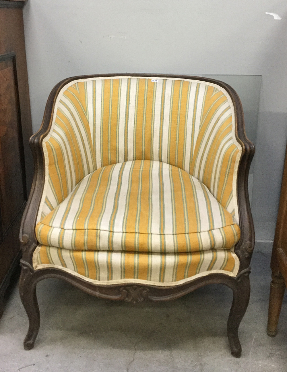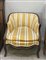 Coppia di poltroncine a pozzetto con gambe e braccioli intagliati e scanalati rivestite in tessuto a righe