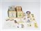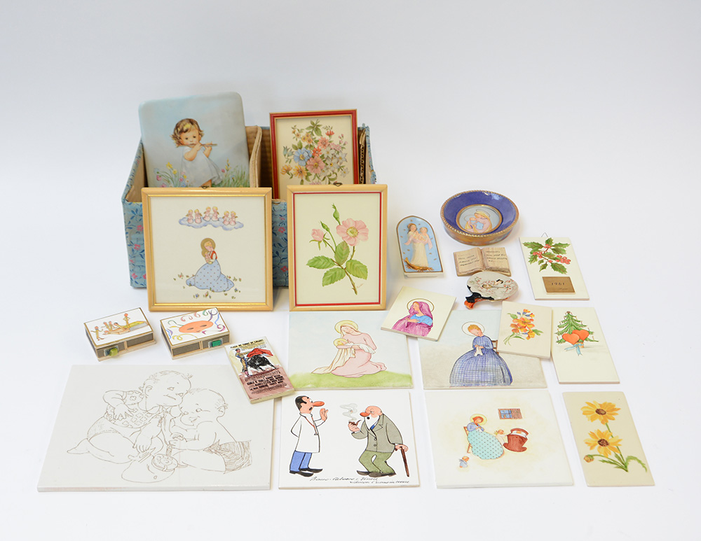 Cartone contenente numerose piastrelle e placche di diverso decoro