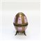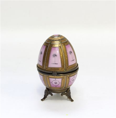 Scatola a forma di uovo in porcellana policroma e oro con ghiera e piedini in metallo