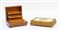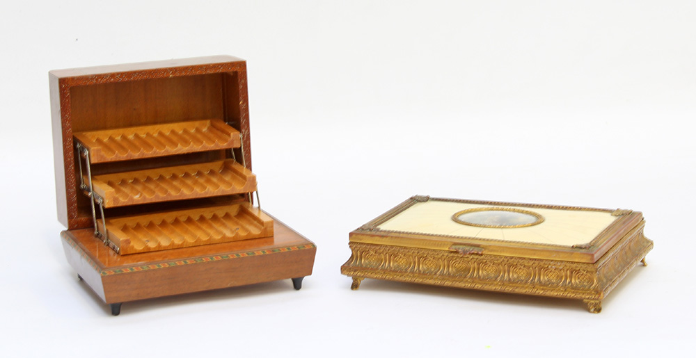 Lotto composto da una scatola in metallo dorato con coperchio decorato da placchetta raffigurante figure femminile e un portasigarette con carillon