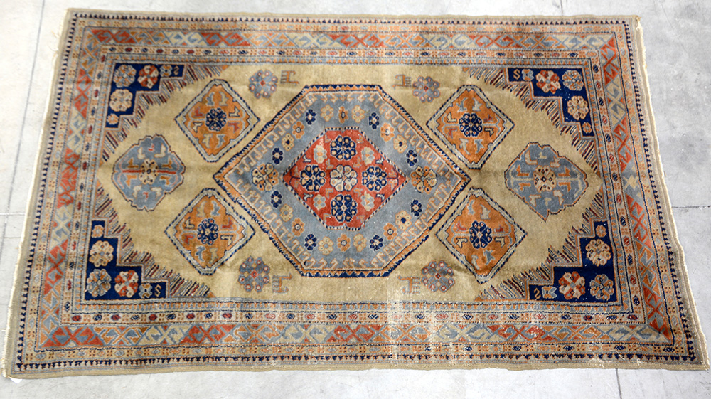 Disegno con grande medaglione ottagonale nei toni dell’azzurro e rosso su fondo giallo (cm 236x152) (difetti)