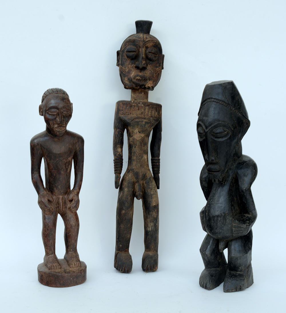 Arte africana, lotto di tre sculture in legno raffiguranti personaggi maschili (h max cm 68) (difetti)