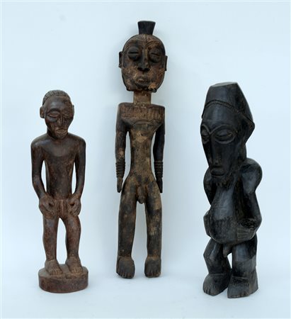 Arte africana, lotto di tre sculture in legno raffiguranti personaggi...