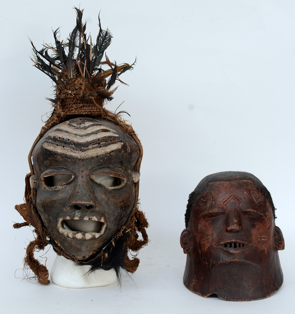 Arte africana, lotto di due maschere rituali, di cui una a casco, in legno, pigmenti, fibre vegetali, piume e pelo animale (difetti)