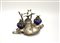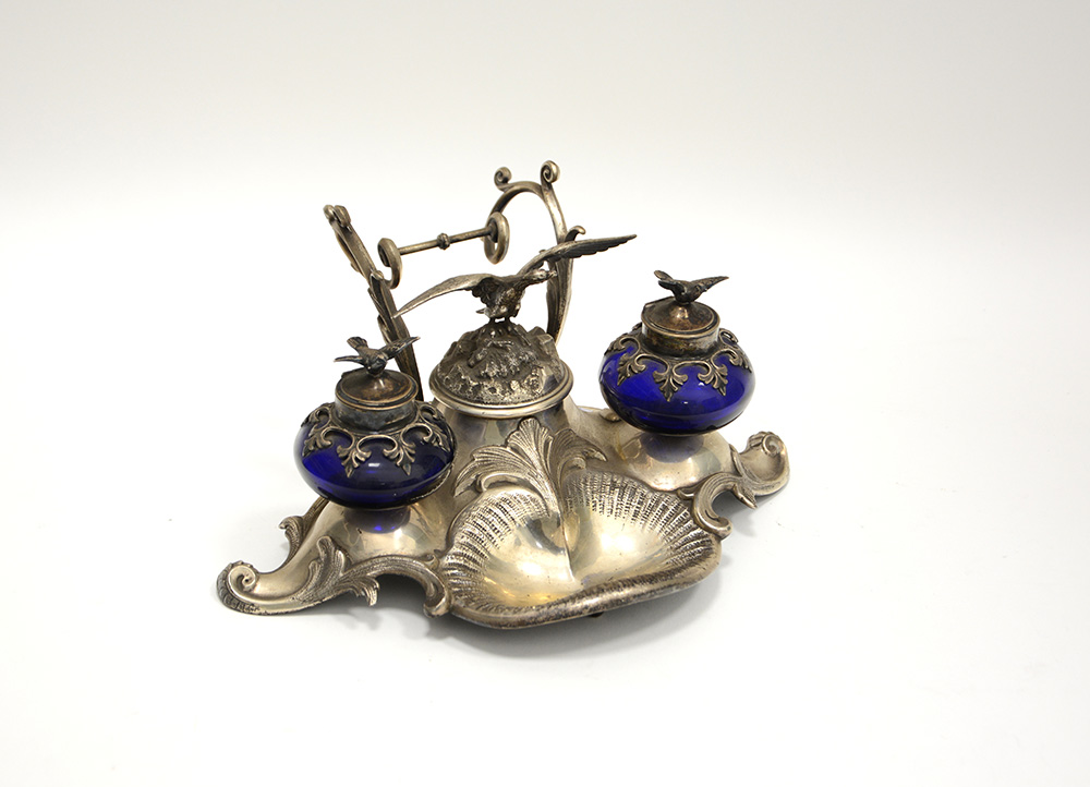 Calamaio in argento cesellato decorato a conchiglia e volatili a tutto tondo, vaschette per inchiostro in vetro blu (difetti)