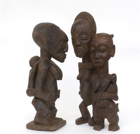 Arte africana, lotto di tre sculture in legno con figure di maternità (h max...