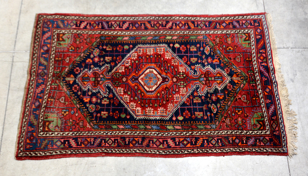 Tappeto Mossul, Persia secolo XX. Disegno con medaglione rosso su campo blu...