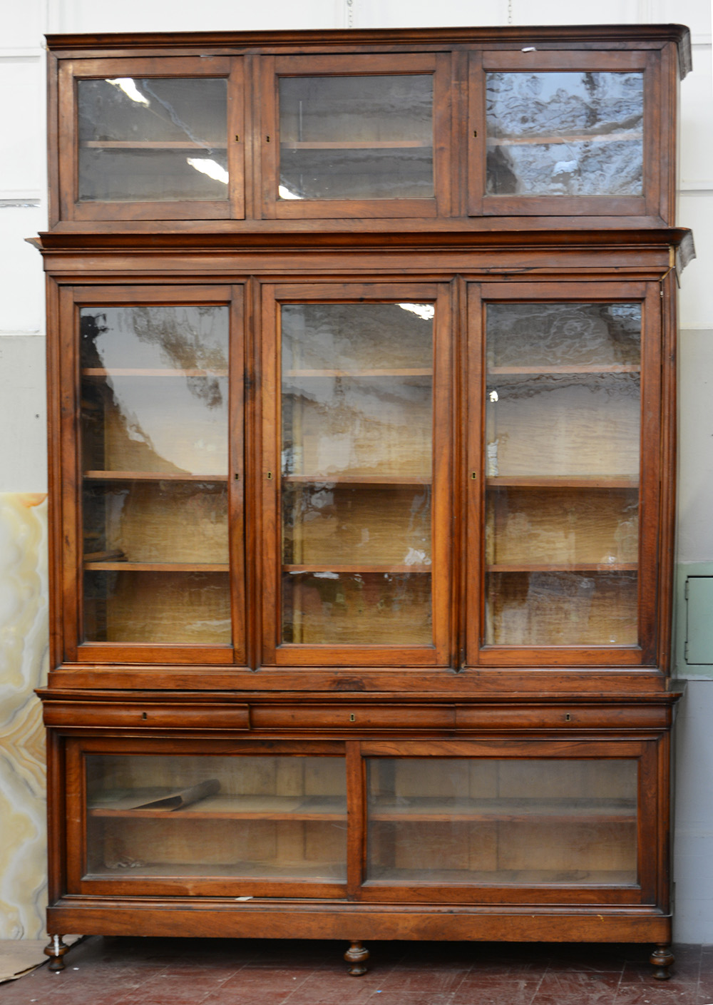 Libreria a sei ante a vetri di diversa misura, tre cassetti nella fascia e parte inferiore con due ante scorrevoli, secolo XIX (cm 210x290x50)(difetti)
